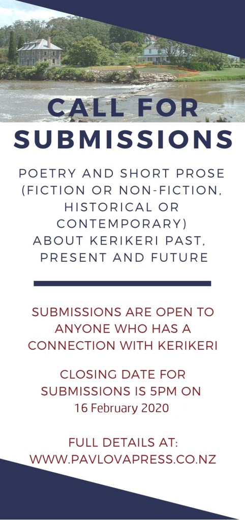 Pavlova Press has extended its call for submissions until 16 February for the proposed volume of Kerikeri stories and poetry. Further details are available here.