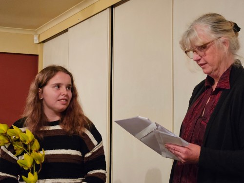 The inaugural Northland Youth Award was presented to seventeen-year-old Emma Philips from Ararua. Amongst an impressive line-up of young writers from around the globe, Emma entered the International Flash Fiction Youth Competition run by fingers comma-toes and received a Commendation for her story entitled: Aim: To Find Out If It Is Possible To Reach A Velocity At Which The Gravitational Influence of a Small Town Can be Escaped From. Hearing Emma read her highly original and entertaining story was an absolute delight.
