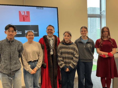 Young writers L to R: Ronan Leung Commended, Skye Sayer Highly Commended, Mayor Vince Cocurullo, Phoebe Sephton 1st, Olivia Scott 2nd, Samantha Nicholson 3rd.